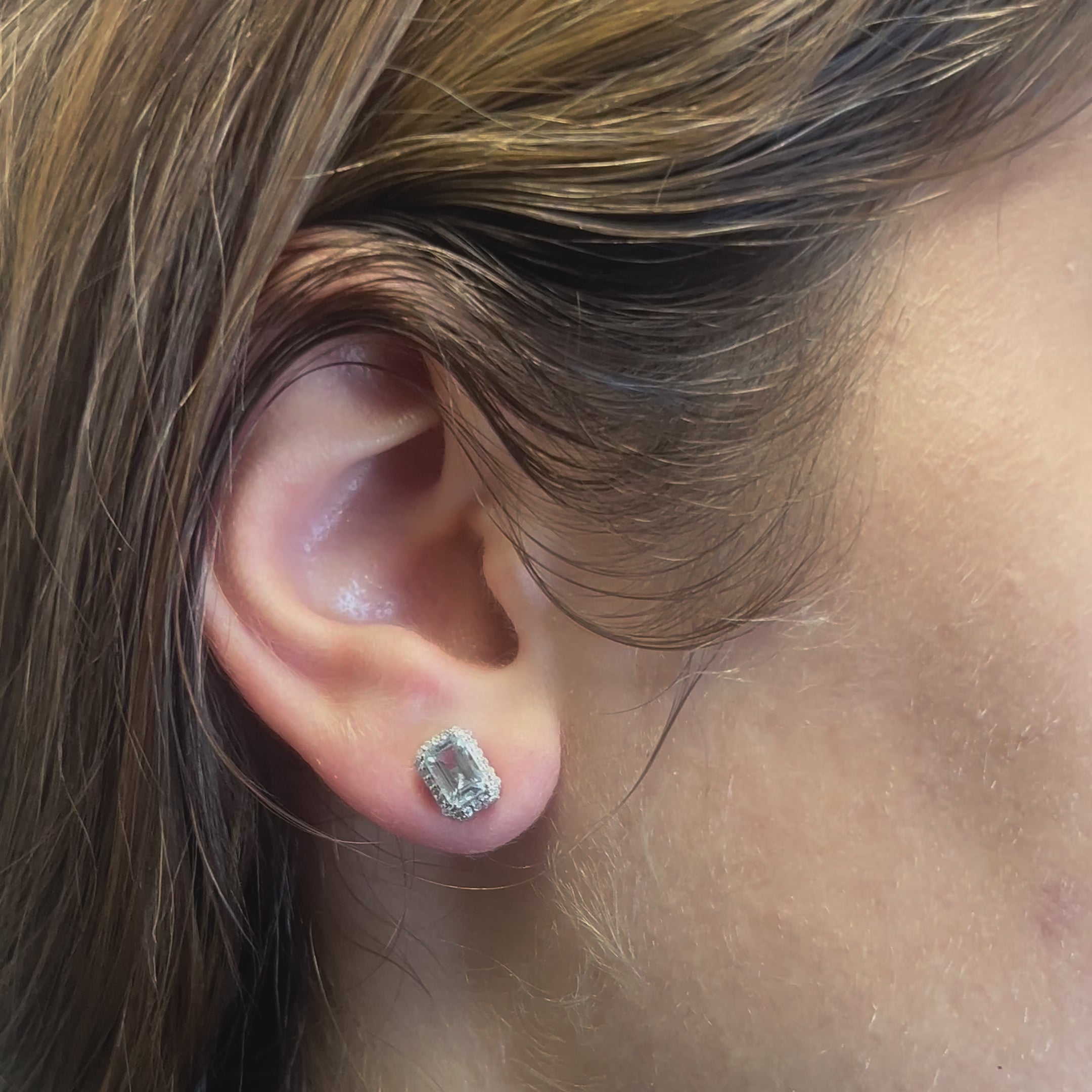Each earring showcases a beautiful emerald-cut Aquamarine as the focal point. Surrounding each emerald is a halo of dazzling diamonds. The diamonds are meticulously set to enhance the brilliance and sparkle of the Aqua. The halo design creates a stunning contrast between the vibrant green of the emeralds and the brilliance of the diamonds, elevating the overall aesthetic of the earrings.