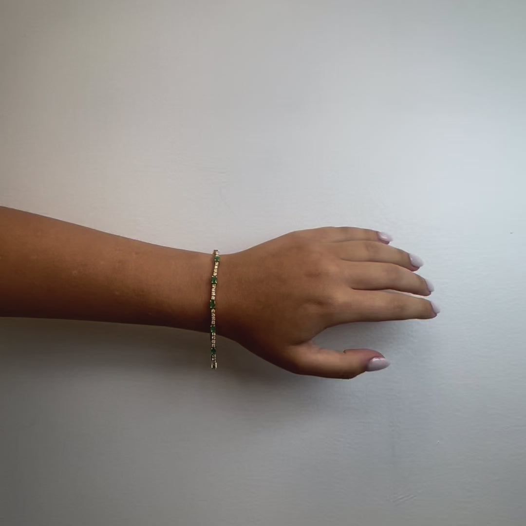 The bracelet showcases a seamless integration of diamonds and emeralds, each held securely in a classic 4-prong setting. The brilliance of the diamonds and the  green hue of the emeralds, creates a mesmerizing visual effect that draws the eye.