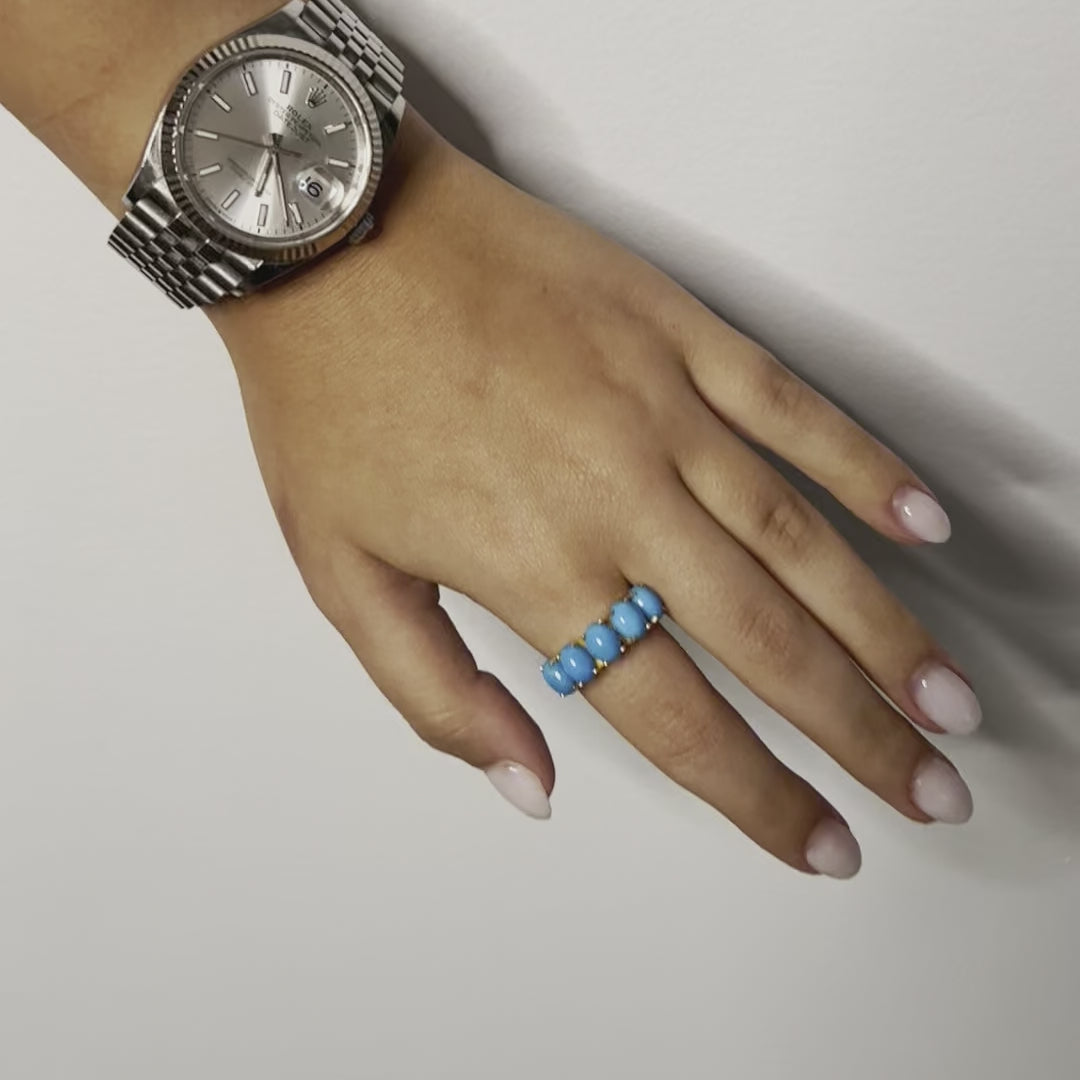 Expertly set in lustrous 14K gold, the five turquoise gemstones are elegantly arranged in a graceful arc, allowing the colors and textures of each stone to harmoniously blend. The intricate metalwork adds a touch of artisanal craftsmanship, enhancing the ring's elegance and character.