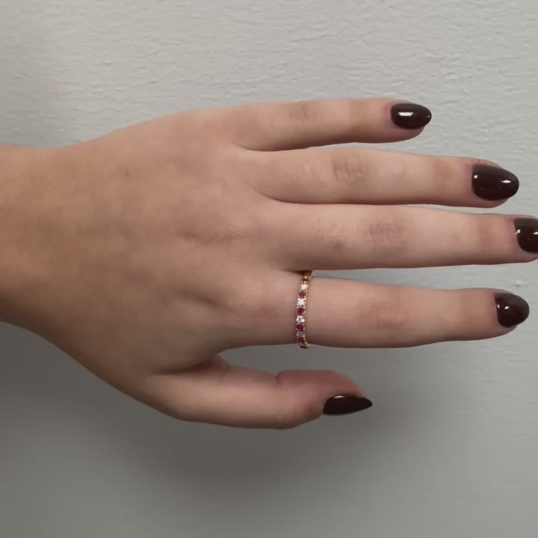 A timeless expression of elegance and passion, the Capucelli Alternate Diamond and Ruby Halfway Band Ring is a delicate yet radiant piece designed to captivate. Expertly crafted in 14K gold, this stunning band showcases an alternating pattern of brilliant-cut diamonds and vivid red rubies, creating a striking contrast of fire and sparkle.