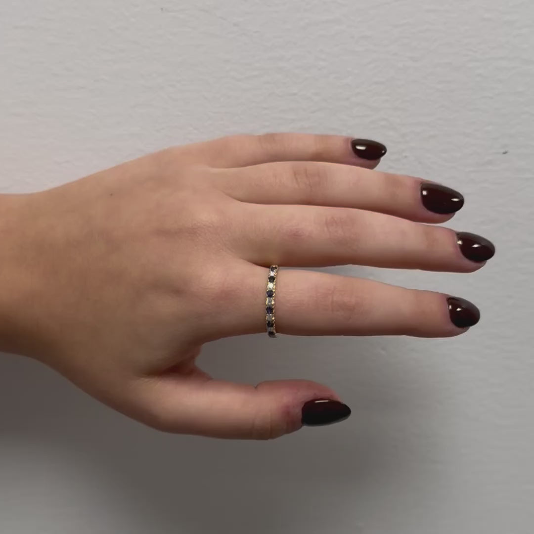 Elevate your jewelry collection with the Capucelli Alternate Diamond and Sapphire Halfway Band Ring, a delicate yet striking piece designed for timeless elegance. Crafted in 14K gold, this exquisite band features a stunning alternating pattern of brilliant-cut diamonds and deep blue sapphires, creating a mesmerizing contrast of sparkle and color.