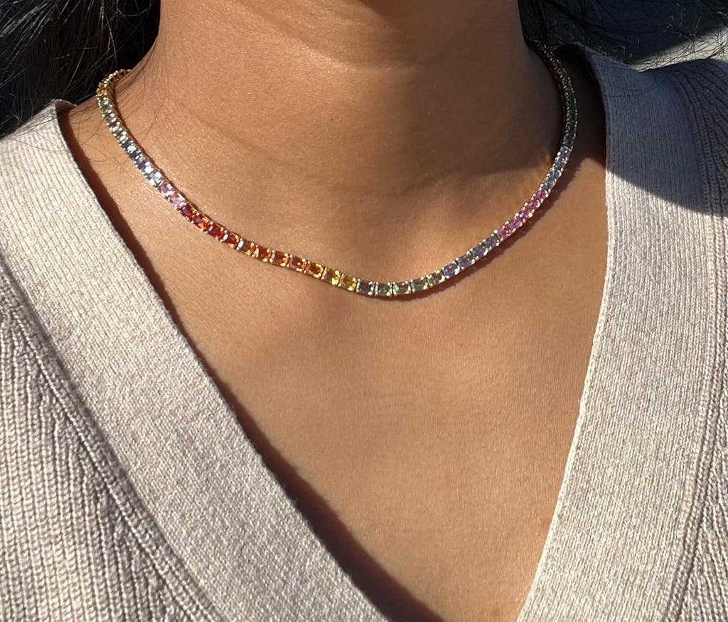 The Rainbow Multi-Color Sapphire Emerald Cut Tennis Necklace is an exceptional and unique piece of jewelry, perfect for those who want to make a bold and colorful fashion statement. Whether worn for a special occasion or as a cherished addition to a jewelry collection, this necklace is sure to attract admiration and attention for its exquisite design and vibrant colors.